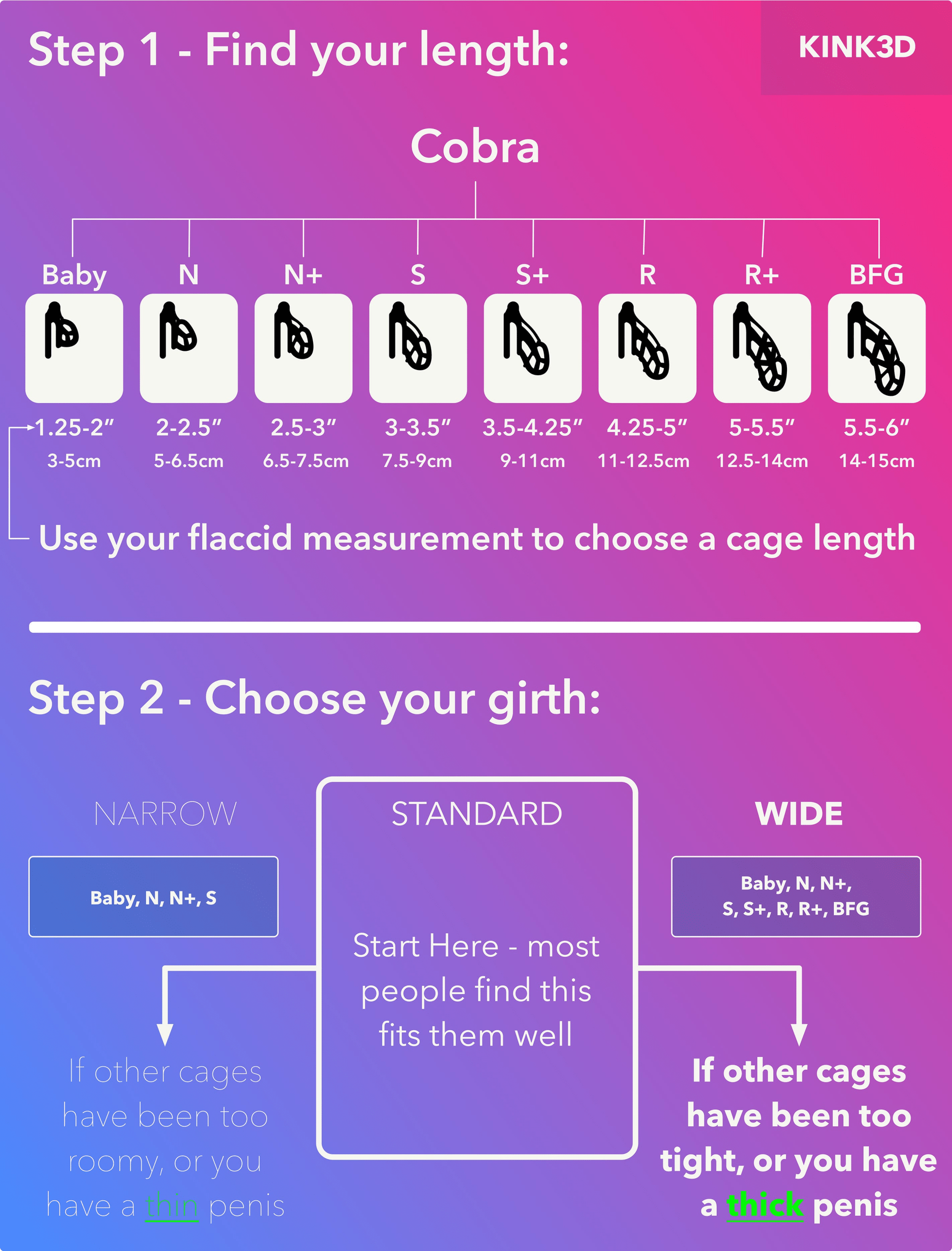 The Baby Cobra cage is suggested for a flaccid length of 1.25-2″ (3-5 cm).