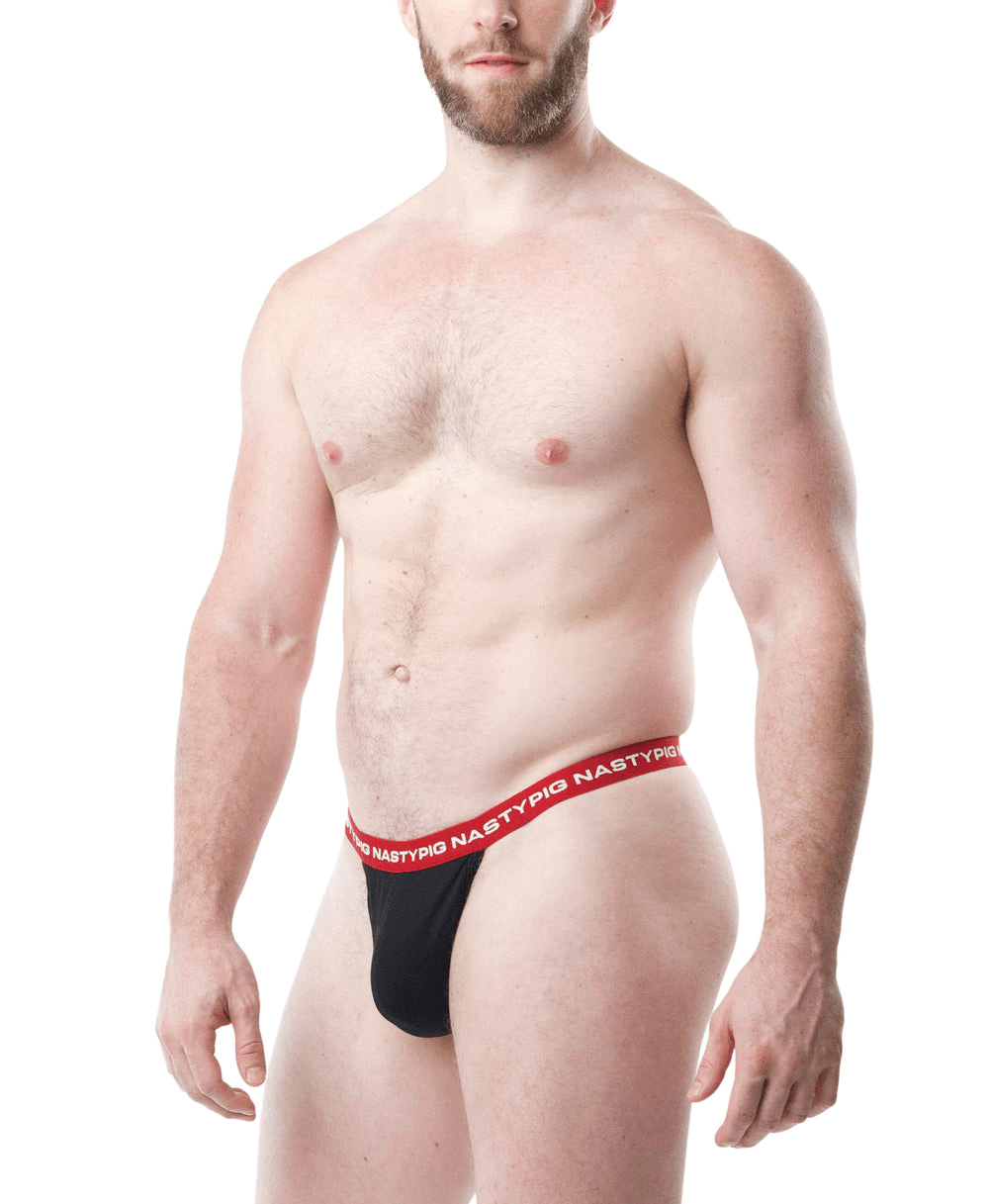 The Lift Club Thong isn’t subtle—and that’s the point. With its sleek black body, bold red waistband, and signature NASTYPIG branding, it’s built to show off. A contoured pouch keeps you supported up front while the back leaves nothing to the imagination. Whether you’re lifting at the gym or lifting brows in the locker room, this thong commands attention and keeps it.
